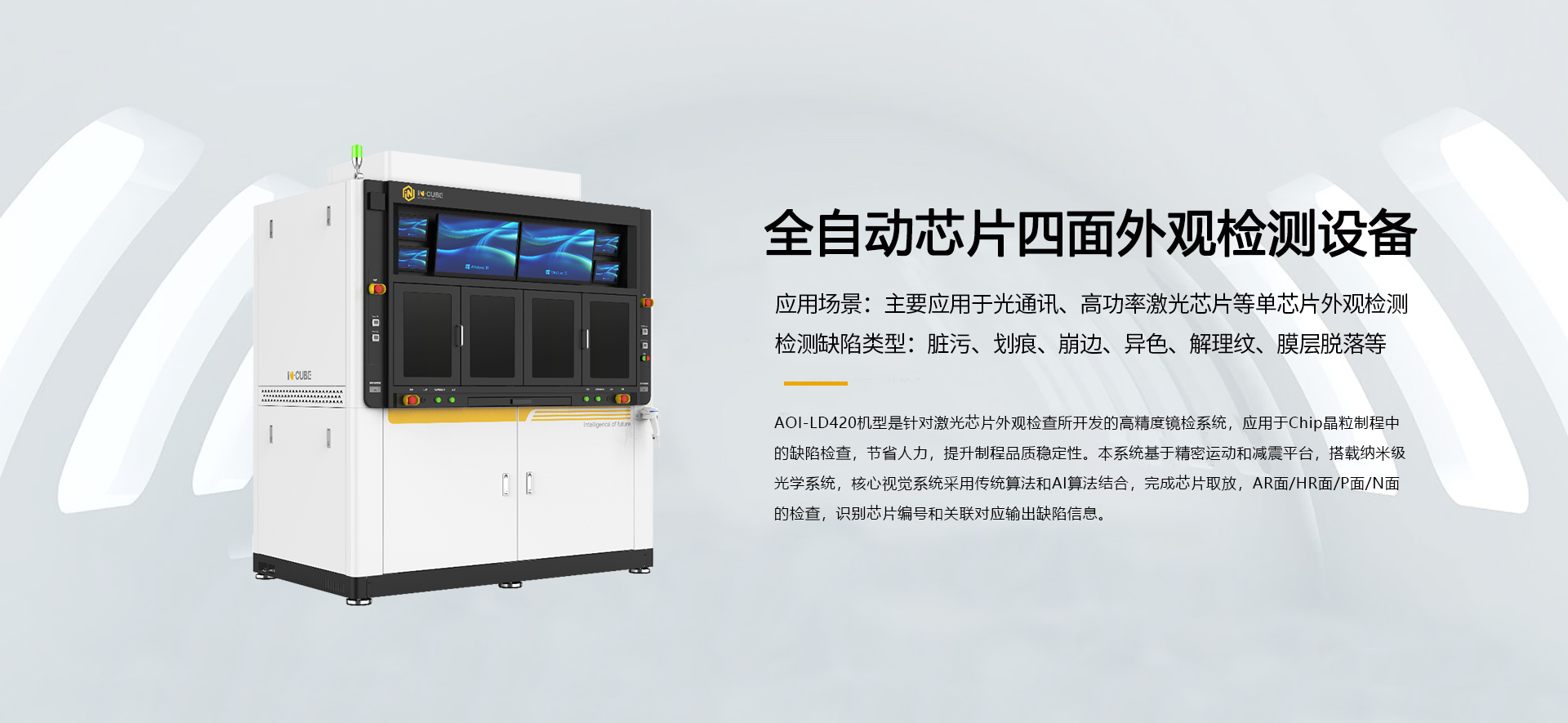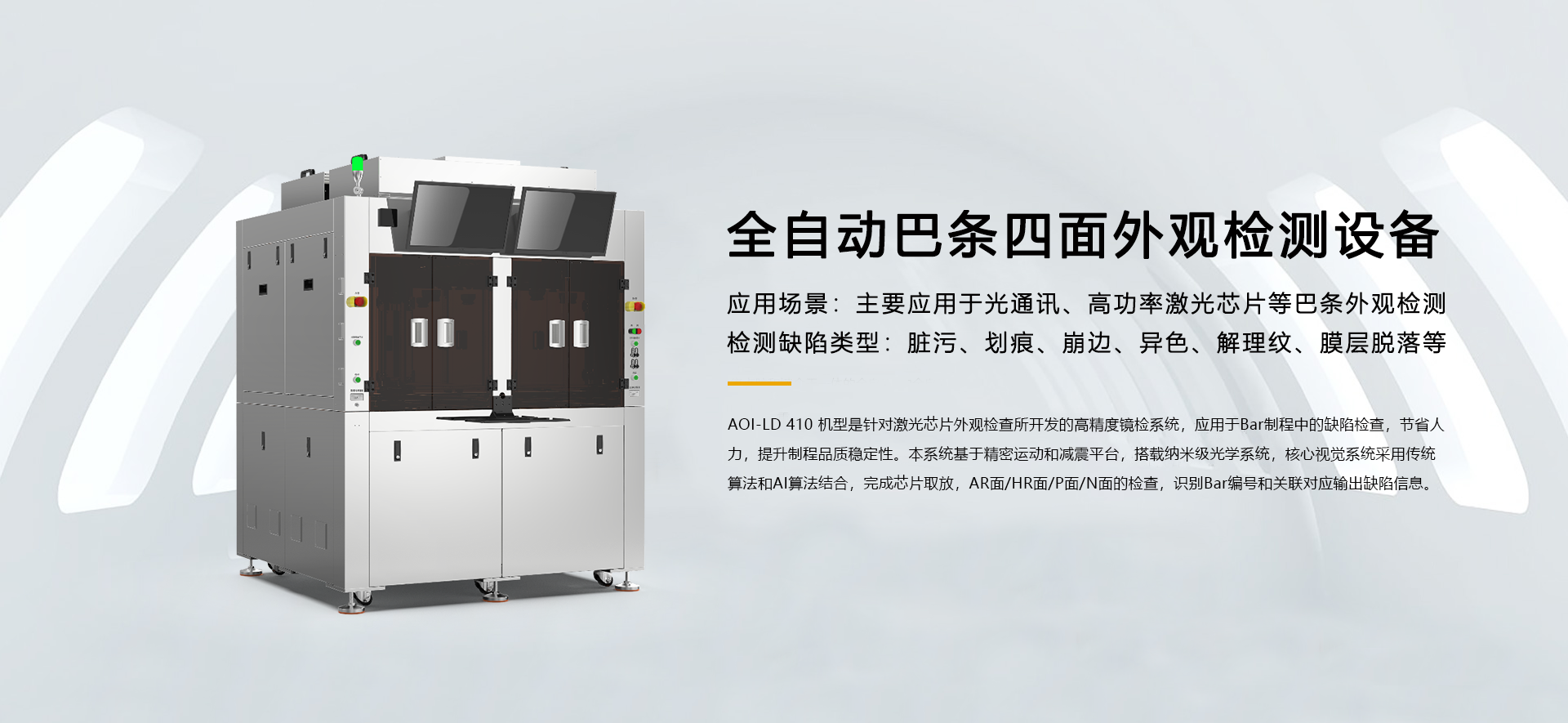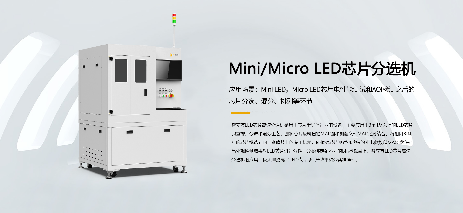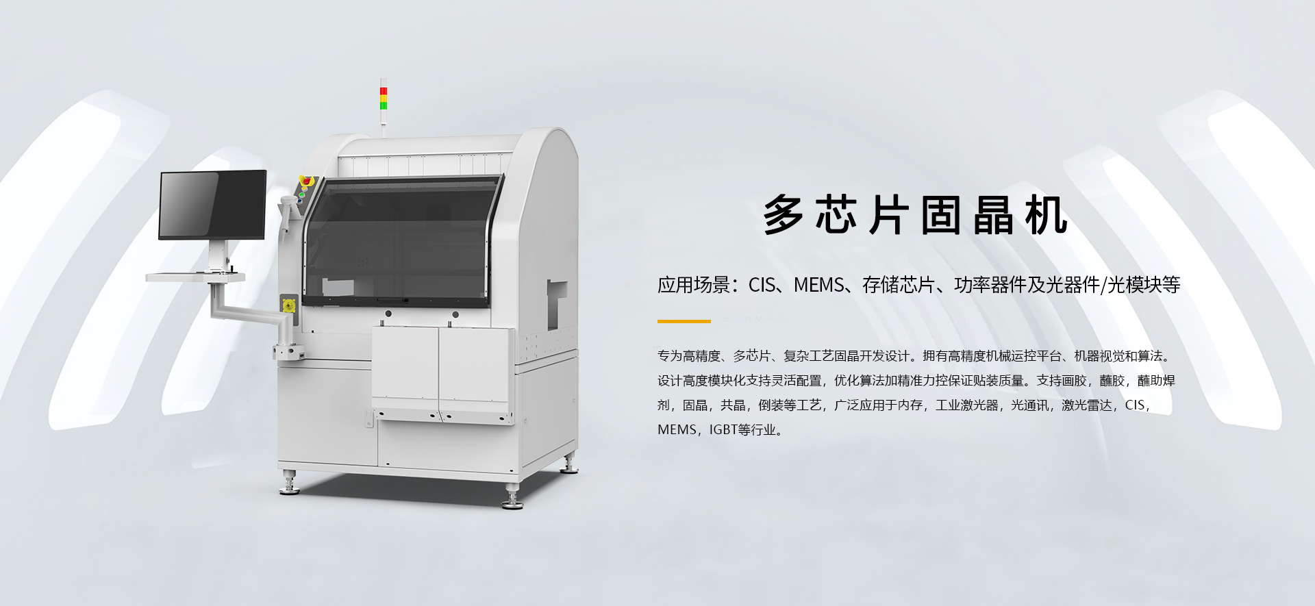 关于我们About关于我们Aboutkingkong官网刮刮乐立于2011年,于2022年7月11日在创业板上市,股票代码301312。属于高端装备制造行业,是一家专注于半导体及工业自动化设备研发、生产、销售及相关技术服务的高新技术企业,为下游客户的半导体工艺制程,精密检测,智能制造系统、精益和自动化生产体系提供专业解决方案。 公司核心业务为半导体中道和后道制程的分选、AOI、固晶设备及传感器性能测试设备。产品包括工业自动设备、自动设备配件及相关技术服务,主要应用于半导体领域中道和后道封测的晶圆/芯片分选、AOI、固晶等工艺环节,光学性能、电性能、力学性能等功能性测试环节,消费电子、电子烟、工业电子、汽车电子等领域产品的组装环节,帮助用户实现生产线的半自动和全自动,提高生产效率和产品良品率。